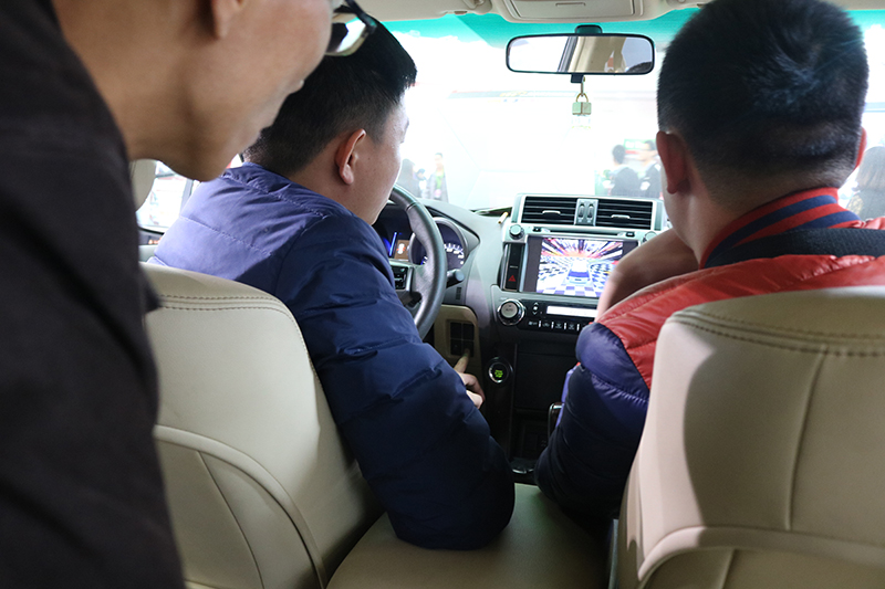 道可視這次展會主推的超清360度全景影像系統(tǒng),其清晰度達(dá)到1080P。不僅僅是清晰度的提升,更解決了因?yàn)橐挂暷芰Σ蛔愣_車主的夜間泊車、倒車難題;四路攝像頭實(shí)時錄像,智能震動鎖定技術(shù),3D全景泊車,24小時不間斷泊車監(jiān)控等功能吸引了一大批客商的駐足參觀,在展車體驗(yàn)過程中對我們?nèi)诵曰腢I交互設(shè)計(jì)和便捷的功能操作贊賞有加。