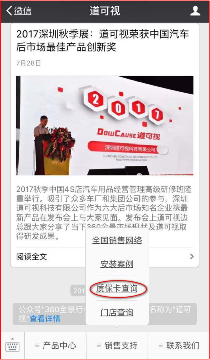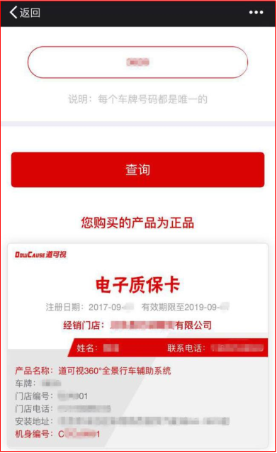 1、查詢產(chǎn)品真?zhèn)?/span>:通過電子質(zhì)保系統(tǒng)可以查詢到自己安裝的是否是道可視正品360全景,杜絕仿冒產(chǎn)品。
