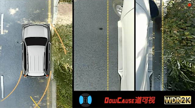 此時(shí),道可視的“??柯费履J健痹诘管?chē)檔模式下開(kāi)啟雙閃時(shí),會(huì)將車(chē)身兩側(cè)(整個(gè)車(chē)身、前后輪、踏板等)同時(shí)顯示,以這種近場(chǎng)垂直的鳥(niǎo)瞰圖顯示方式,配合安全參考線,有效的解決了??柯费聲r(shí)可能對(duì)輪胎及輪轂造成刮傷的問(wèn)題。